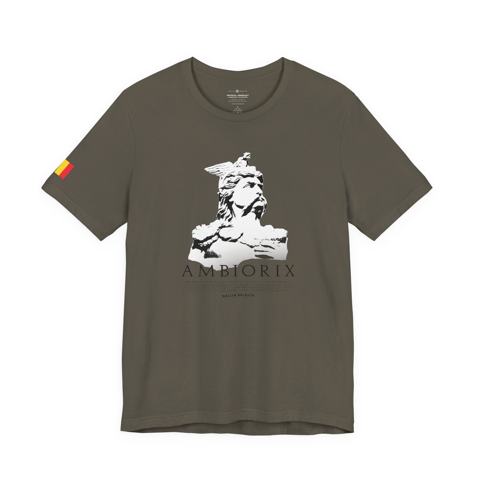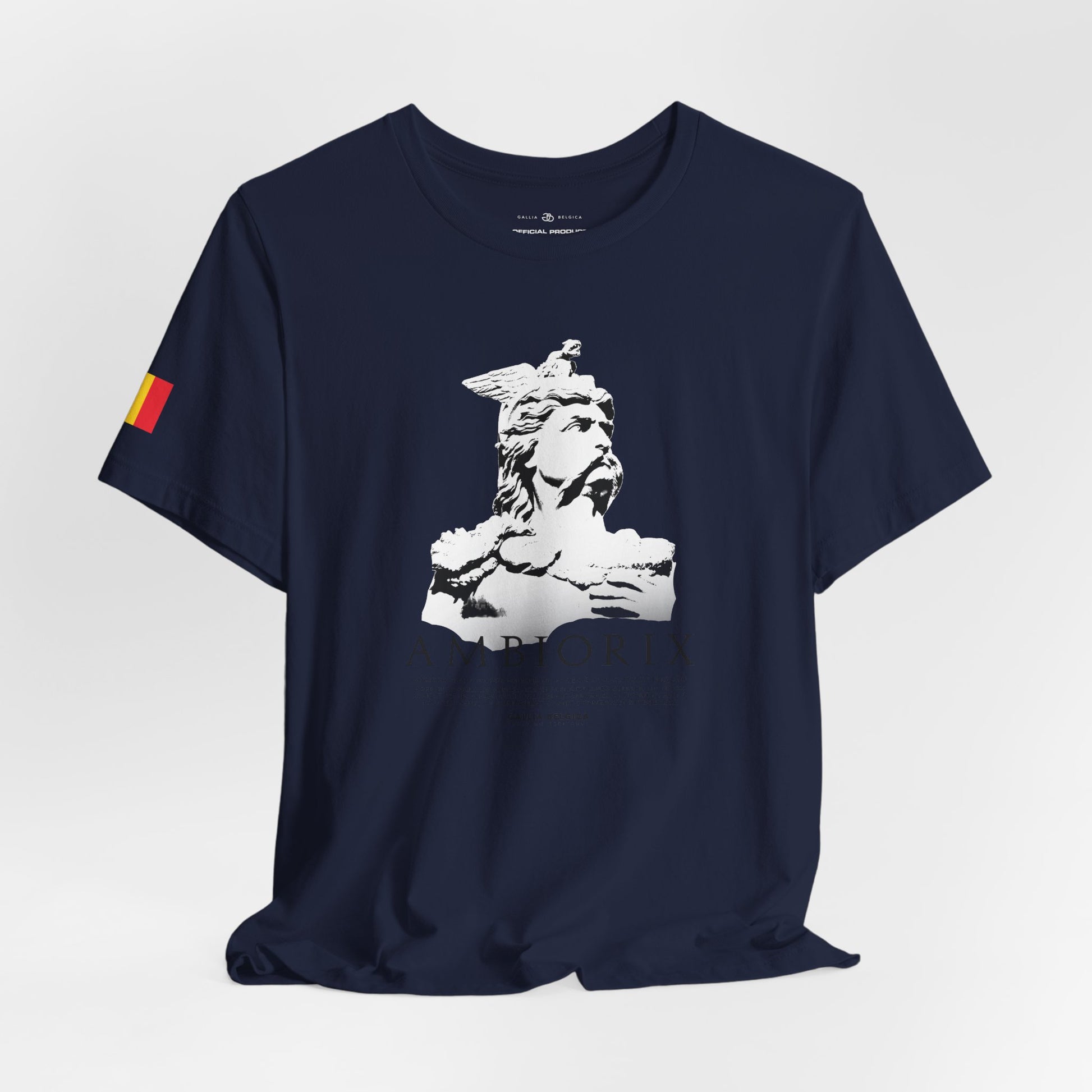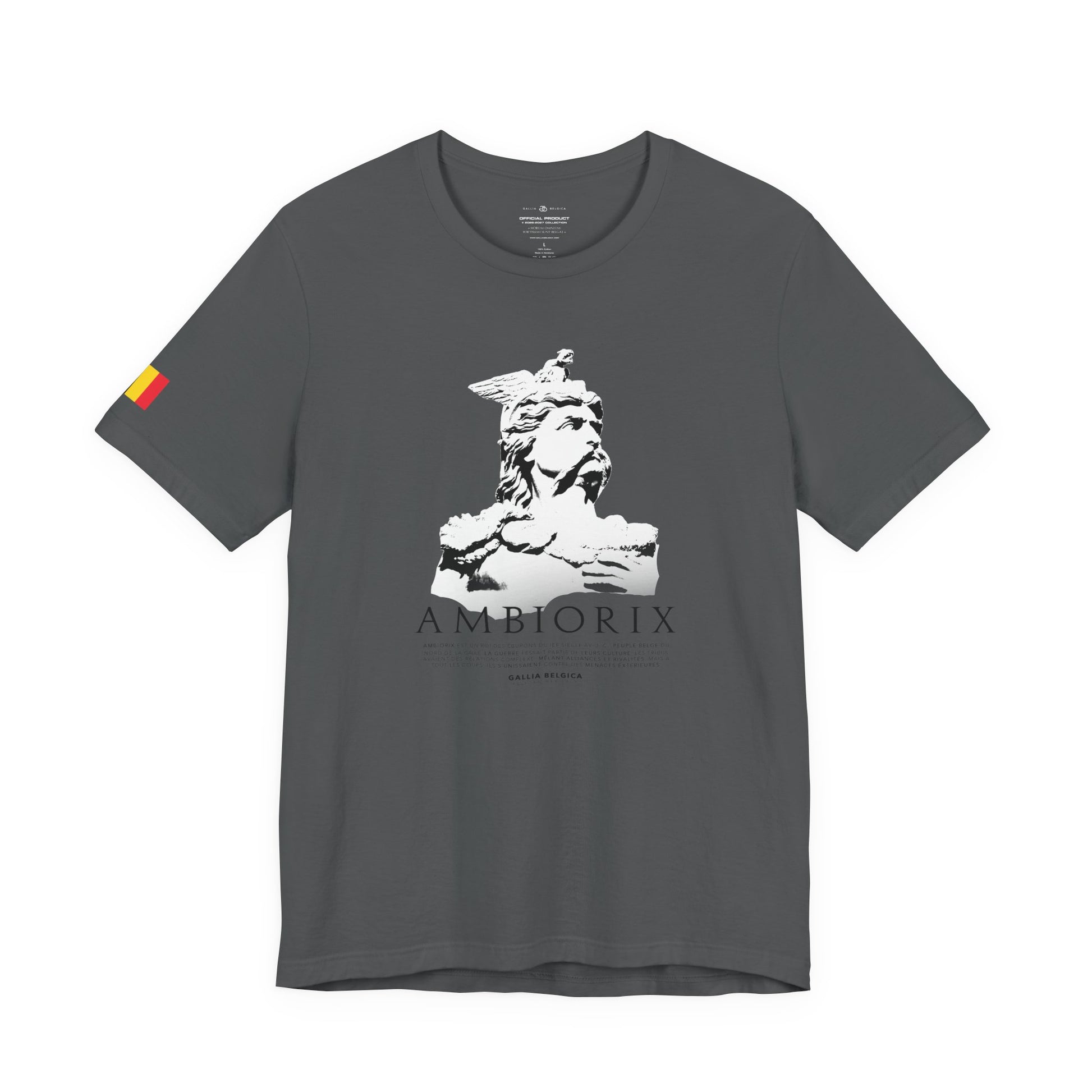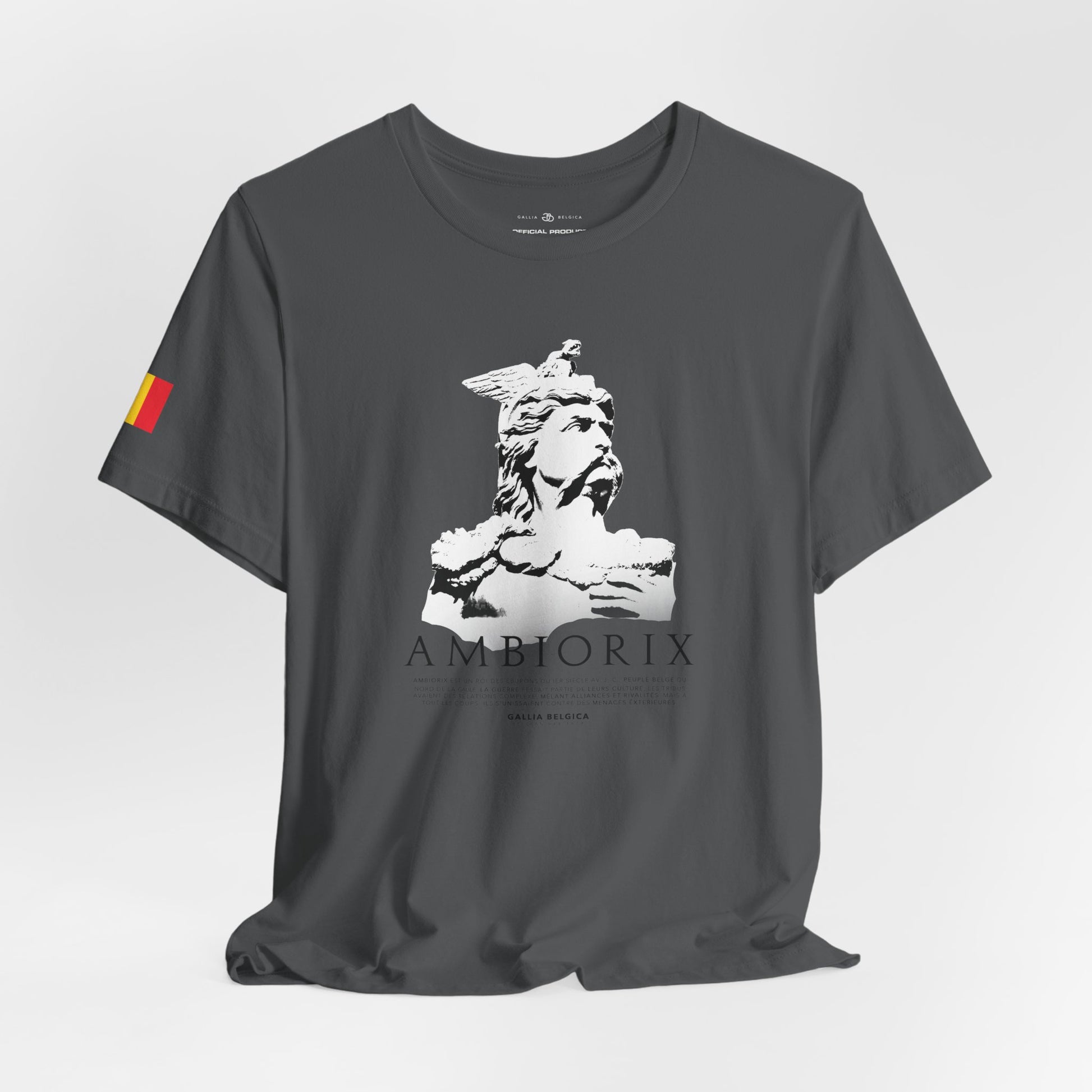 A light and comfortable t-shirt inspired by the legendary, Ambiorix. Designed for those who wish to wear his strength and courage every day. The soft, breathable quality ensures all-day comfort. With elasticated rib collar, side seams and double-needle stitching on sleeves and hem. Chose between white, charcoal, black or blue navy and step into the courage of a warrior, wherever life takes you. With a Belgian flag on the