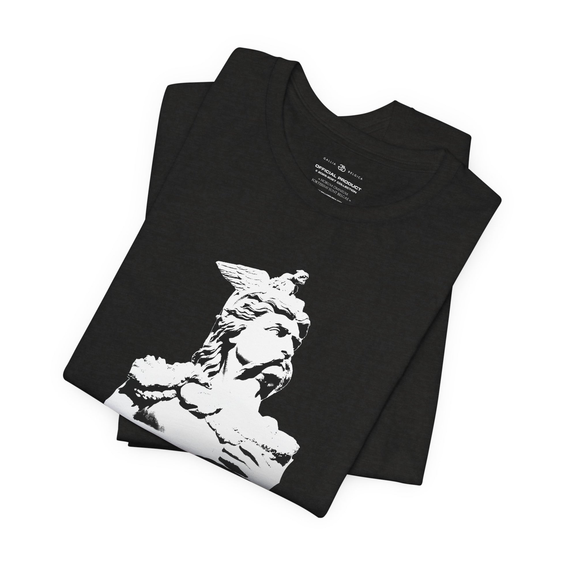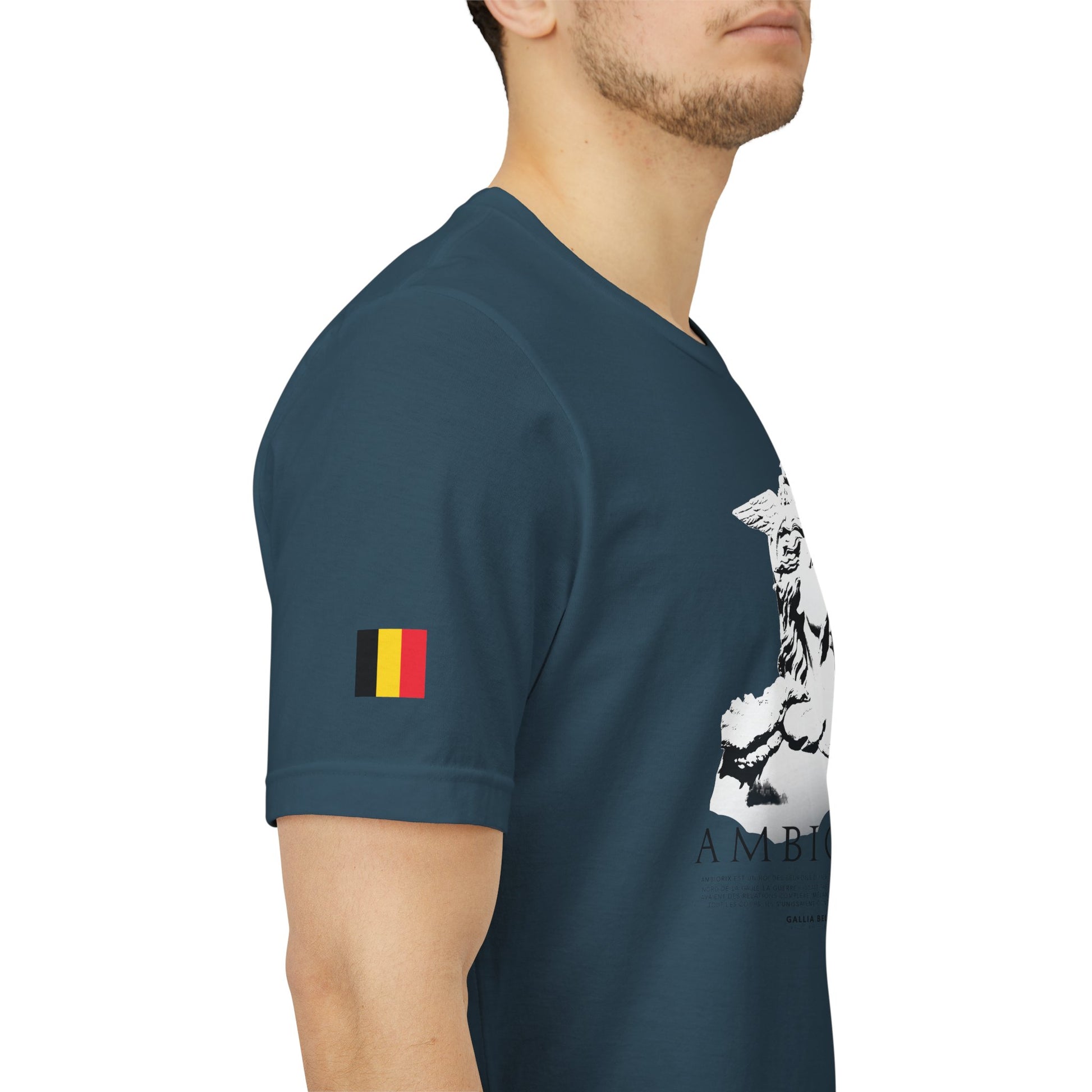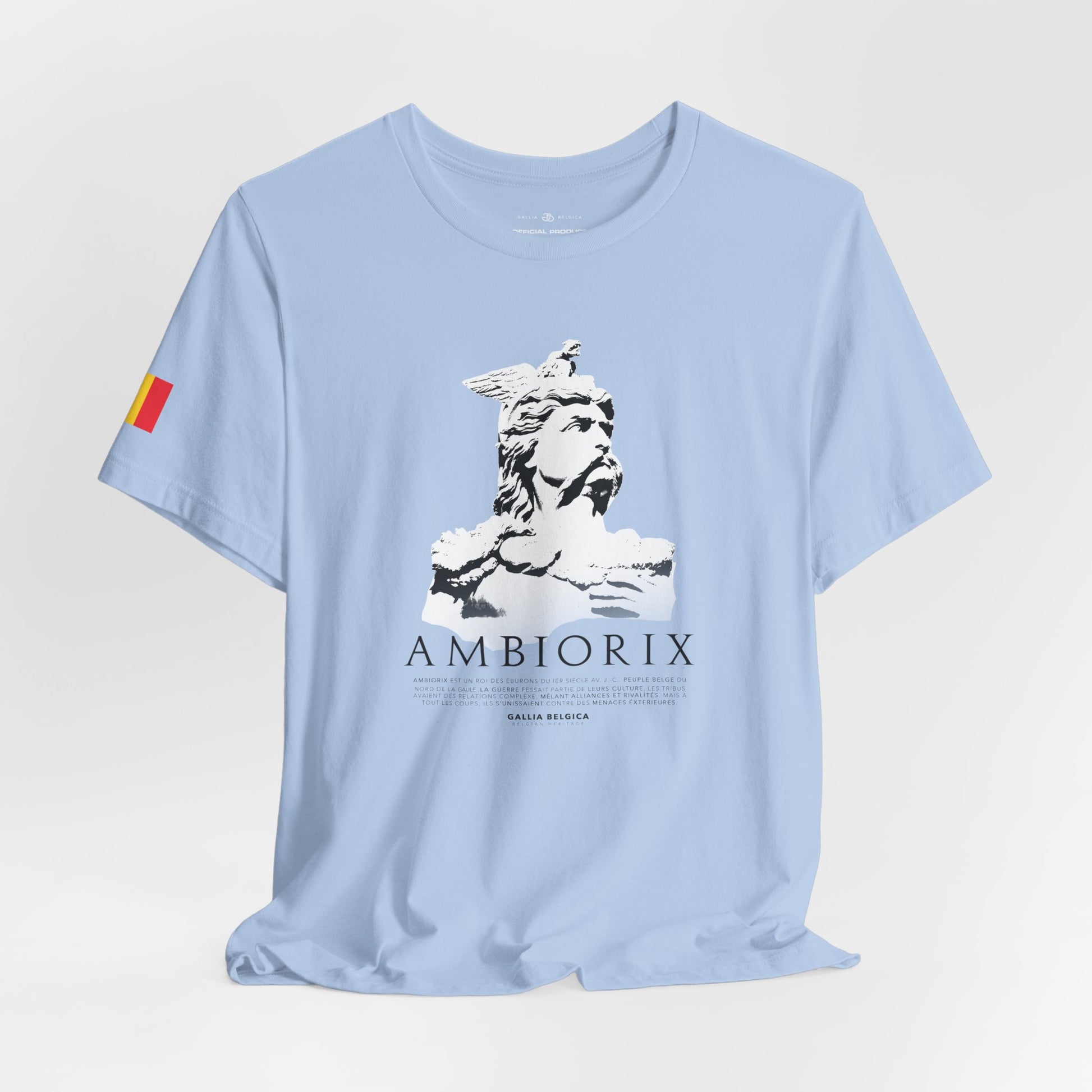 A light and comfortable t-shirt inspired by the legendary, Ambiorix. Designed for those who wish to wear his strength and courage every day. The soft, breathable quality ensures all-day comfort. With elasticated rib collar, side seams and double-needle stitching on sleeves and hem. Chose between white, charcoal, black or blue navy and step into the courage of a warrior, wherever life takes you. With a Belgian flag on the