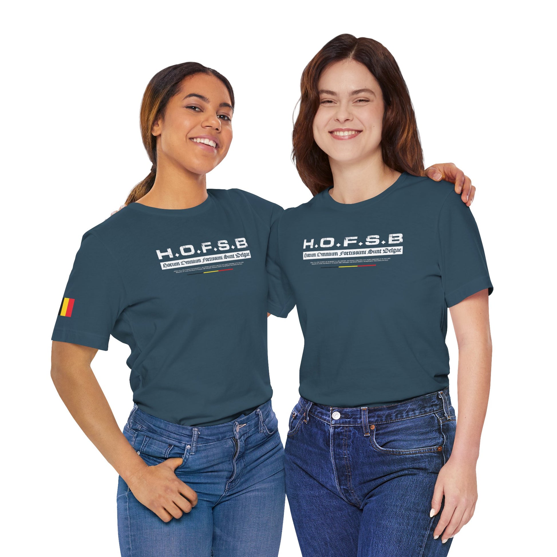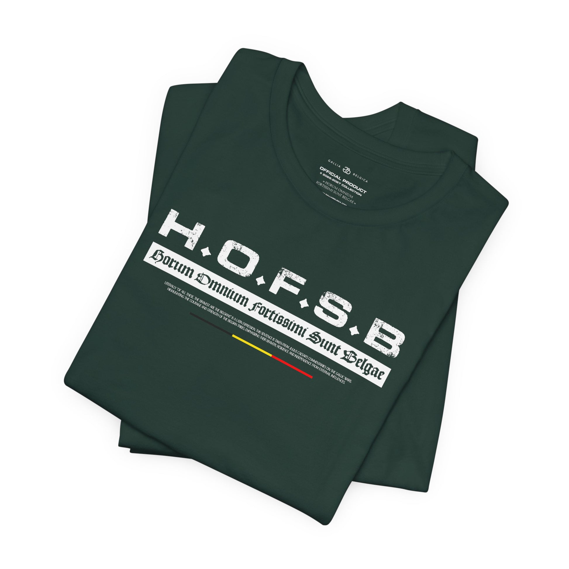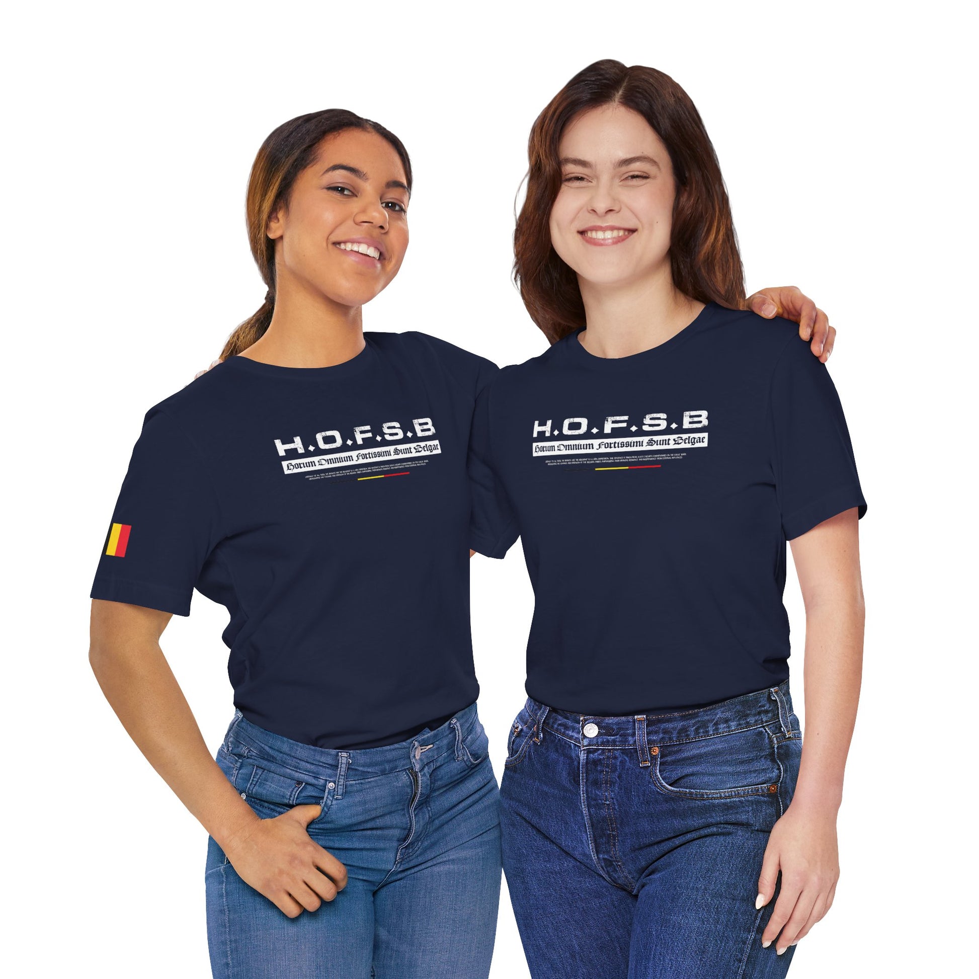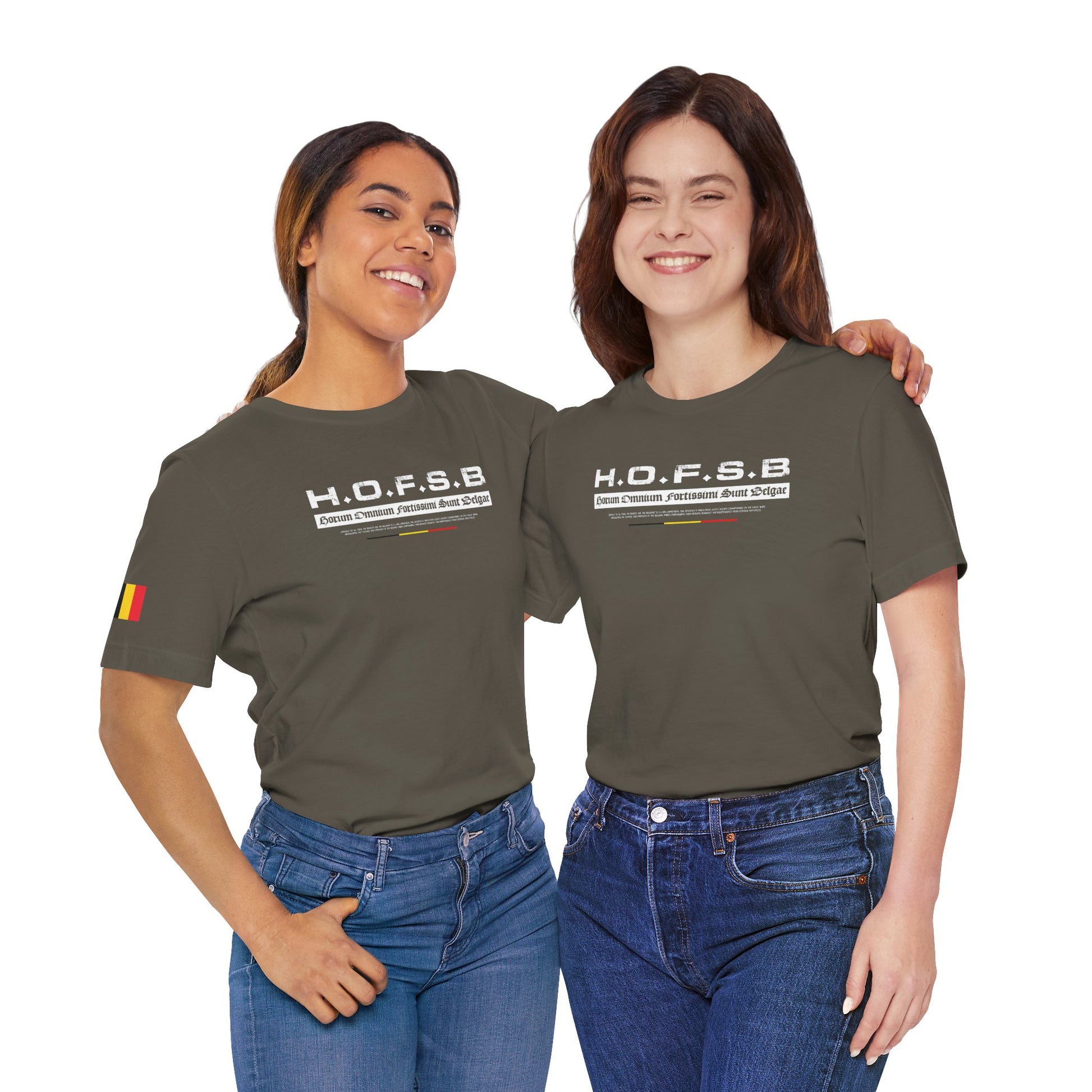 The H.O.F.S.B T-shirt remember the bravery of the Belgae tribes. "Horum omnium fortissimi sunt Belgae" is a famous Latin phrase from Julius Caesar's, meaning: "Of all these, the Belgians are the bravest." Made from soft, high-quality cotton, it’s both comfortable and chic, ensuring you stand out with a touch of wit and cultural flair. Their battle spirit burned like an unquenchable flame, driven by a fierce love for freedom and an unbreakable bond to their land. They stood as a wall of defiance against the mighty Roman legions, fearless even in the face of overwhelming odds. The Belgae were not just warriors—they were symbols of defiance, proof that the human spirit, fueled by pride, honor, and unity, can challenge even the greatest empires.
